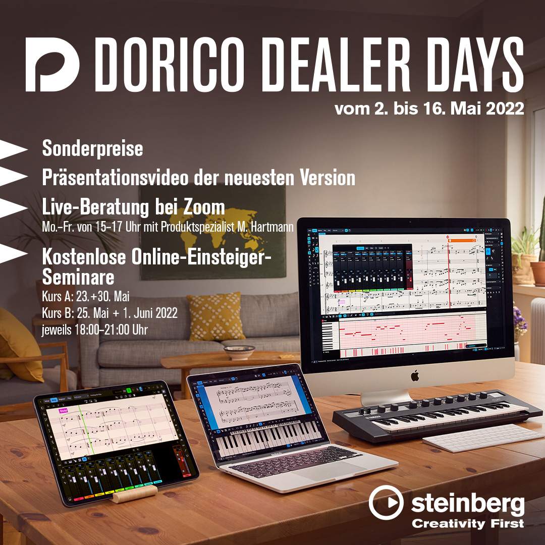 Vom 2.-16. Mai finden bei uns die Dorico Dealer Days 2022 statt. In diesem Zeitraum gibt es bei uns attraktive Sonderpreise der Notationssoftware Dorico Pro 4 und Dorico Elements 4 – auch für EDU-Versionen und Umsteiger von anderen Programmen.
