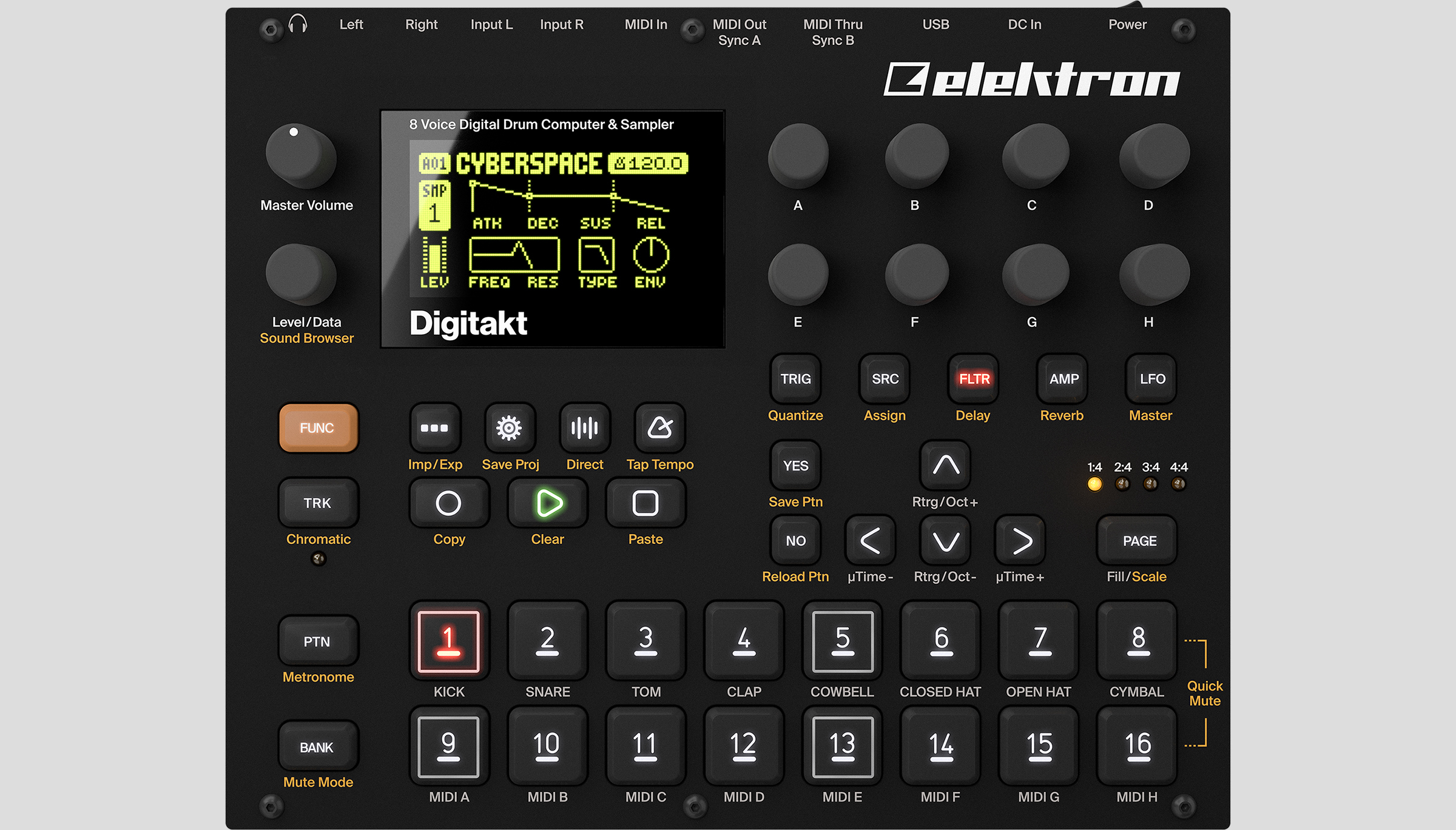 Digitakt ist eine kompakte Sampling-Drum-Maschine, die in der Lage ist, monströse Beats zu erzeugen oder fein geschichtete Sample-Landschaften zu zaubern, bevor Sie Ihre Kreation mit Elektrons Live-freundlichem Sequenzer entfesseln können. Drum-Maschinen sind eine Spezialität von Elektron, aber das ist nur die Hälfte der Geschichte von Digitakt. Sehen Sie zu, wie er ein Spektrum sorgfältig ausgearbeiteter Sounds in jede Geschichte einwebt. Überlassen Sie der Maschine das Sprechen und sehen Sie, wohin die Geschichte führt.