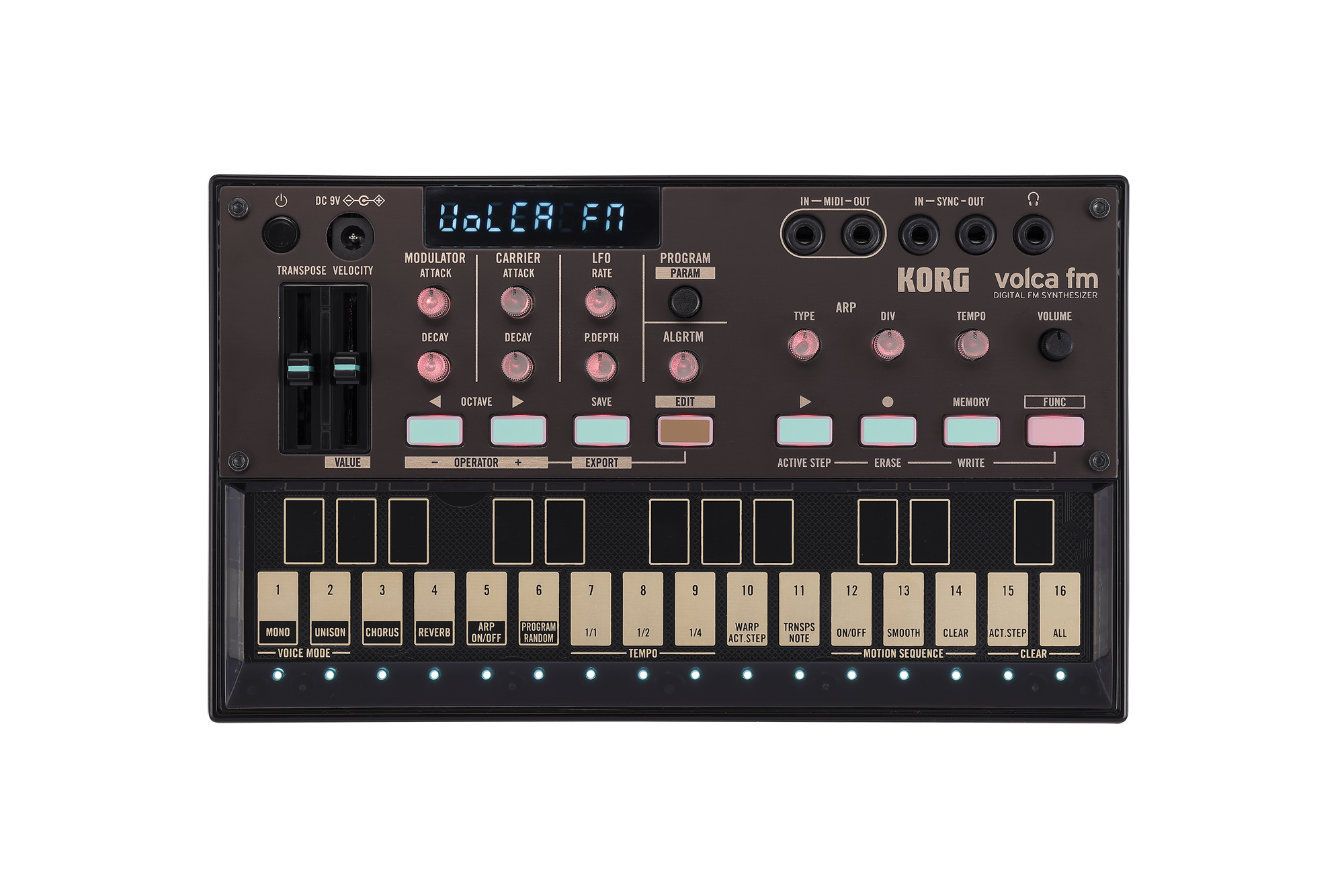 Der volca fm der zweiten Generation ist ein 6-stimmig polyphoner FM-Synthesizer mit 6 Operatoren und 32 Algorithmen, der mit Leichtigkeit die klassischen FM-Sounds der 80er- und 90er-Jahre reproduzieren kann. Über die intuitive Bedienoberfläche, die die wichtigsten klangformenden Parameter in wenigen Macro-Reglern zusammenführt, lassen sich die Sounds des volca fm auch ganz ohne tiefgehende Kenntnisse der FM-Synthese manipulieren. Natürlich besteht dennoch auch die Möglichkeit, bis in die tiefsten Gefilde der Klangerzeugung hinabzutauchen, um die einzelnen Operatoren im Detail zu bearbeiten. Zum Veredeln der Sounds stehen sowohl ein Chorus- als auch ein Reverb-Effekt zur Verfügung, die auf Wunsch sogar gleichzeitig genutzt und getrennt voneinander geregelt werden können. Als erstes Gerät der volca Serie überhaupt verfügt der volca fm der zweiten Generation nicht nur über einen MIDI IN sondern auch über einen MIDI OUT Anschluss, wodurch sich der interne 16-Step-Sequencer nun auch zum Ansteuern von externen Geräten verwenden lässt. Wird der volca fm über eine anschlagdynamische MIDI-Tastatur angespielt, kann er nun auch auf deren Anschlagdynamik reagieren, wodurch ein besonders expressives Spiel ermöglicht wird. Über die ebenfalls neue Randomize-Funktion lassen sich auf Knopfdruck neue Sounds nach dem Zufallsprinzip generieren. Und der innovative Warp Active Step-Modus des Sequencers fördert besonders ungewöhnliche Rhythmusstrukturen zutage. Neben dieser Fülle an neuen Features birgt der volca fm der zweiten Generation natürlich immer noch die klassischen volca Tugenden und ist so mit seinem integrierten Lautsprecher, der Möglichkeit zum Batteriebetrieb und dem kompakten Formfaktor ein voll ausgestatteter FM-Synthesizer, der sich einfach überall hin mitnehmen lässt.