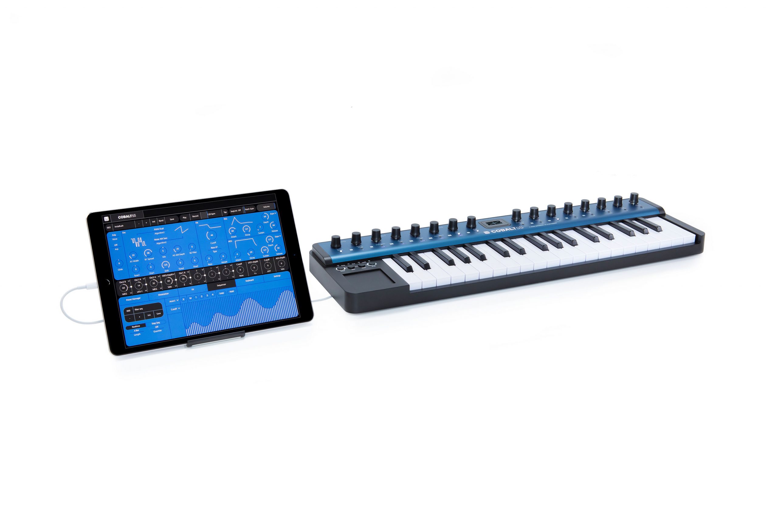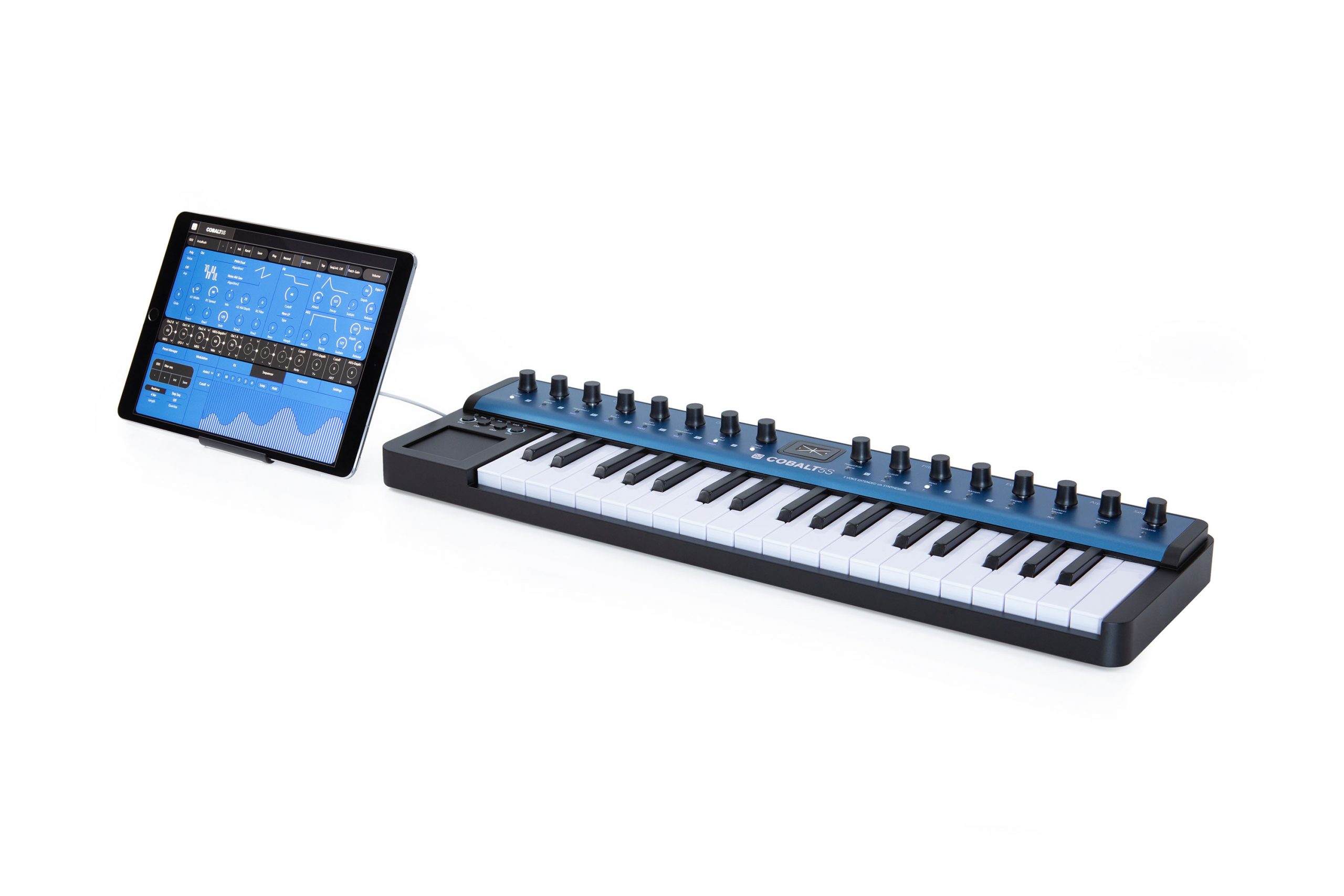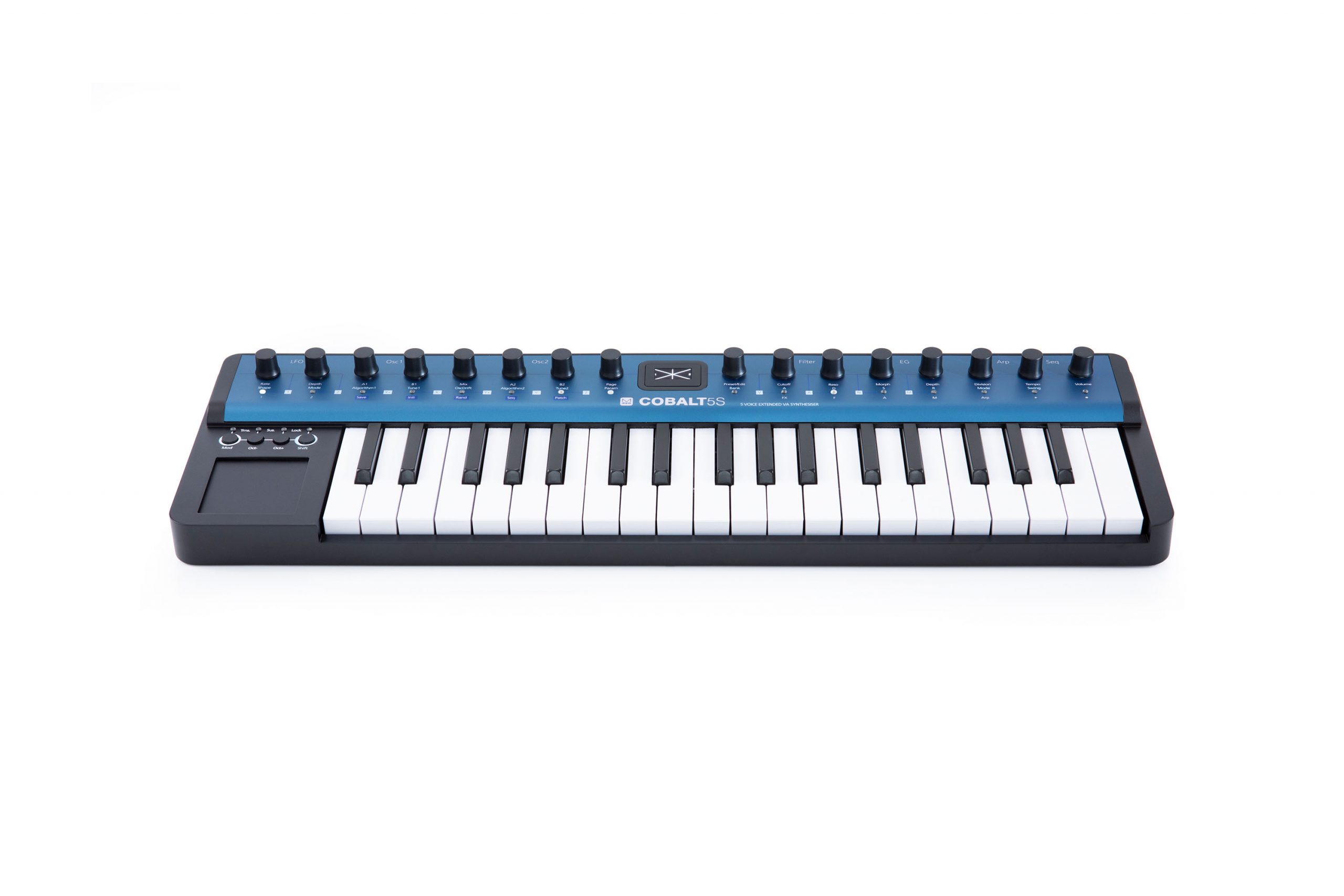 Der COBALT5S ist ein besonders kompakter Vertreter der COBALT Familie von MODAL Electronics und eignet sich daher wie kaum ein zweiter für den mobilen Einsatz. Aus diesem Grund lässt er sich wahlweise auch ganz einfach über USB mit Strom versorgen. Der COBALT5S greift auf die gleiche Klangerzeugung wie seine größeren Geschwister zurück und liefert so trotz des handlichen Formfaktors 5 echt polyphone Stimmen und 40 Oszillatoren (bis zu 8 pro Stimme). Oszillatorseitig werden hochauflösende, virtuell-analoge Wellenformen geboten, die sich mittels der 40 integrierten Algorithmen bis zur Unkenntlichkeit verbiegen lassen. In Kombination mit dem morphbaren 4-Pol-Ladder-Filter sind so zahllose Klänge von klassischen Analogsounds bis hin zu bisher ungehörten Klanglandschaften möglich. Auf Wunsch lassen sich die so erzeugten Klänge dann mit dem programmierbaren Arpeggiator oder dem 64-Step-Sequencer animieren und mit zwei hochqualitativen Effekten (Chorus und Stereo Delay, gleichzeitig nutzbar) veredeln. Die 37 Kompakt-Tasten des COBALT5S sind anschlagdynamisch und verfügen über Aftertouch, was eine besonders expressive Spielweise ermöglicht. Einen entsprechenden, optionalen Controller vorausgesetzt, unterstützt der COBALT5S außerdem MPE (MIDI Polyphonic Expression) für nochmals ausdrucksstärkere Performances. Als besonderer Clou wurde dem Instrument ein X/Y/Z-Touchpad als Modulationsquelle spendiert, das sowohl auf horizontale und vertikale Wischgesten als auch auf Druck reagiert und somit eine Vielzahl von Steuerungsmöglichkeiten übernehmen kann. Über die kostenlose MODALapp lassen sich die Sounds des COBALT5S komfortabel und plattformübergreifend am Bildschirm editieren und verwalten.