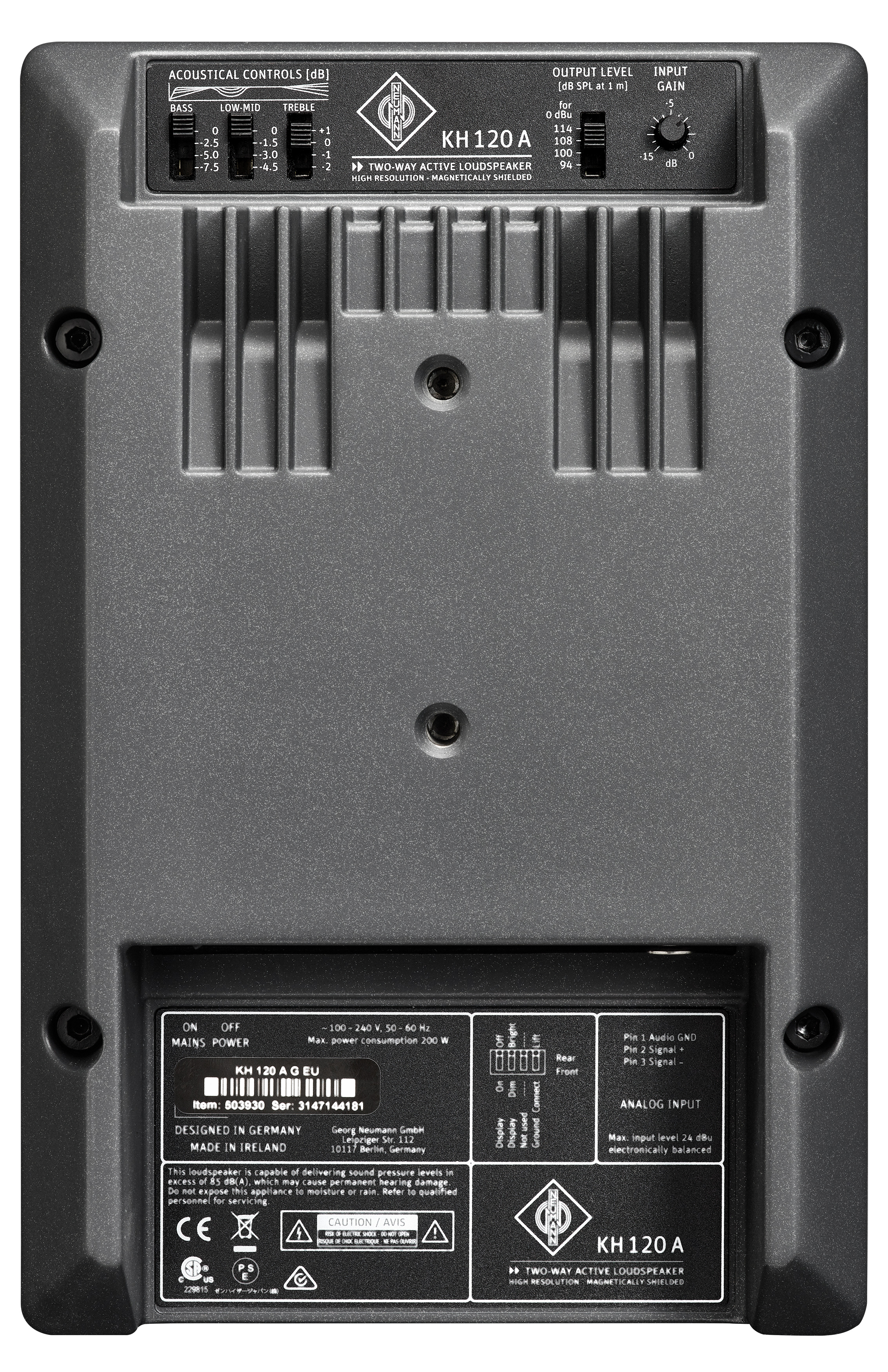 Mit seinem digitalen Schaltnetzteil und Bi-Amp-Verstärkern realisiert der KH 120 bis zu 111,1 dB Schalldruck und bleibt dabei im gesamten Frequenzverlauf hoch auflösend und neutral in der Darstellung. Hier entsteht auch genug Energie für maximale Dynamik ohne Verzerrungen und Verluste. So führt der Bass bis hinab zu beeindruckenden 52 Hertz. Trotz der dazu genutzten Bassreflexkanäle gibt es kein Nachschwingen, keine Trägheit in der Basswiedergabe. Die Transientenansprache bleibt unter feiner Kontrolle. Das optimierte Design der Treiber ermöglicht reinen Sound bis in die untersten 50-Hertz-Regionen. Das satte Fundament bietet genug Spielraum, um auch ohne Subwoofer-Ergänzung sauber im Mix zu arbeiten. In den anspruchsvollen Höhen sichert die eigens entwickelte, leistungsstarke Aluminium-Gewebekalotte eine verzerrungsfreie Wiedergabe.