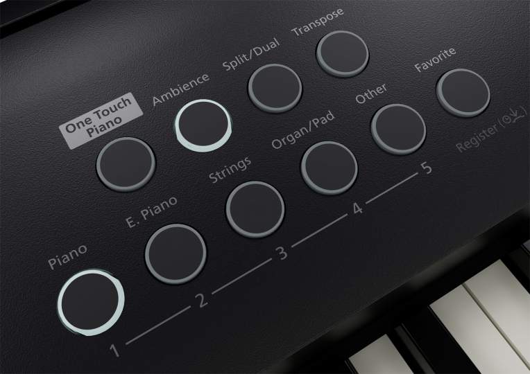 Das FP-E50 ist vollgepackt mit Funktionen, auf die du schnell und einfach zugreifen kannst. In der Standardansicht informiert dich das Display über den gewählten Sound, das Tempo und weitere wichtige Informationen. Die aufgeräumte Bedienoberfläche ermöglicht dabei den direkten Zugriff auf die Soundauswahl, deine Soundfavoriten, die Tastatur-Transposition und mehr. Zahlreiche Taster sind mit einer zweite Funktion belegt, die du durch langes Drücken aufrufen kannst. So kannst du unter anderem Einstellungen speichern oder weitere Parameter bearbeiten, ohne in die Tiefen des Menüs abtauchen zu müssen. Mit den Scenes kannst du zudem komplette Tastatur-Setups auf Knopfdruck abrufen.