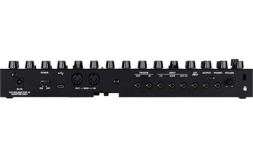 | Anschlüsse: | CV INPUT 3,5mm, EXT INPUT 3,5mm, GATE IN 3,5mm, Kopfhörer-Buchse: 3,5 mm stereo Mini-Klinkenbuchse, LINE OUT 3,5mm stereo, MIDI IN- und OUT-Buchse , Trigger Ausgang 3,5mm, Trigger Eingang 3,5mm mono, USB-Anschluss TYPE B x 1, USB-MIDI Interface, USB Audio Interface, VCF CV INPUT 3,5mm |