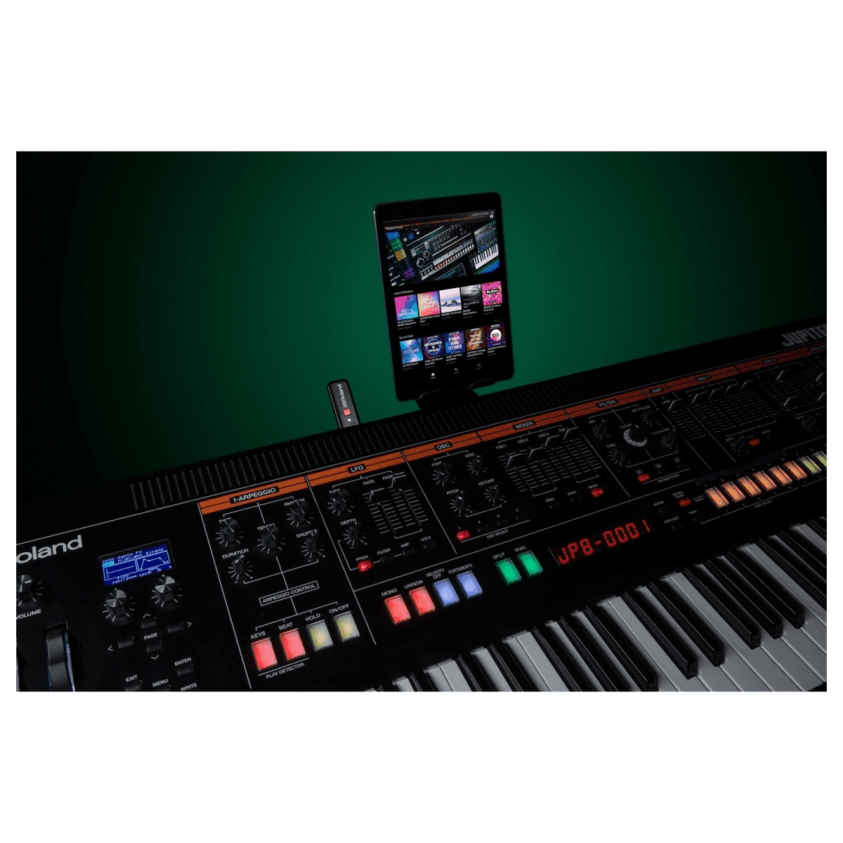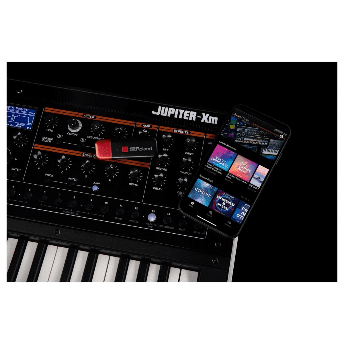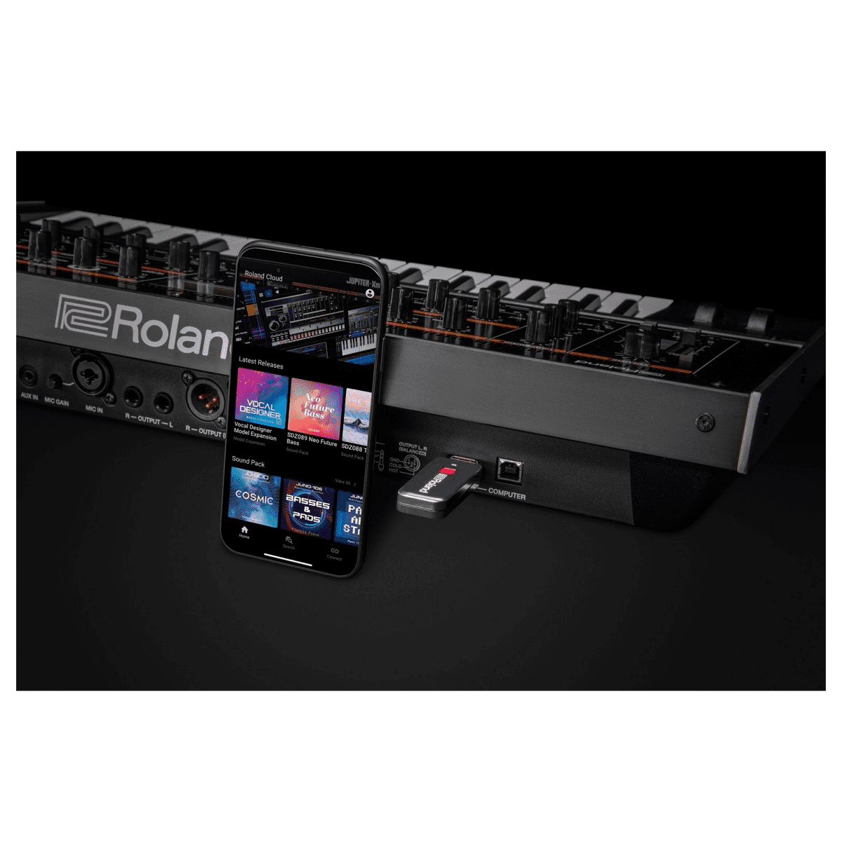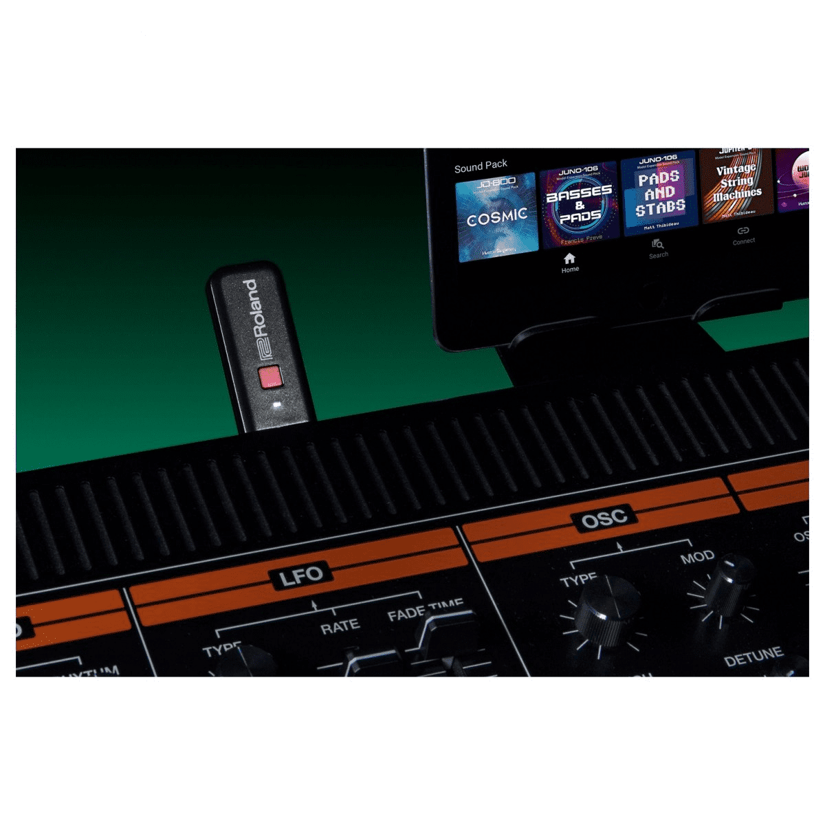 Roland Cloud Connect bietet sofortigen Zugriff auf ein ständig wachsendes Universum voller Tausende ikonischer Sounds und Erweiterungen für Ihr Roland-Hardware-Instrument mit nur Ihr Mobilgerät und den mitgelieferten WLAN-Adapter.