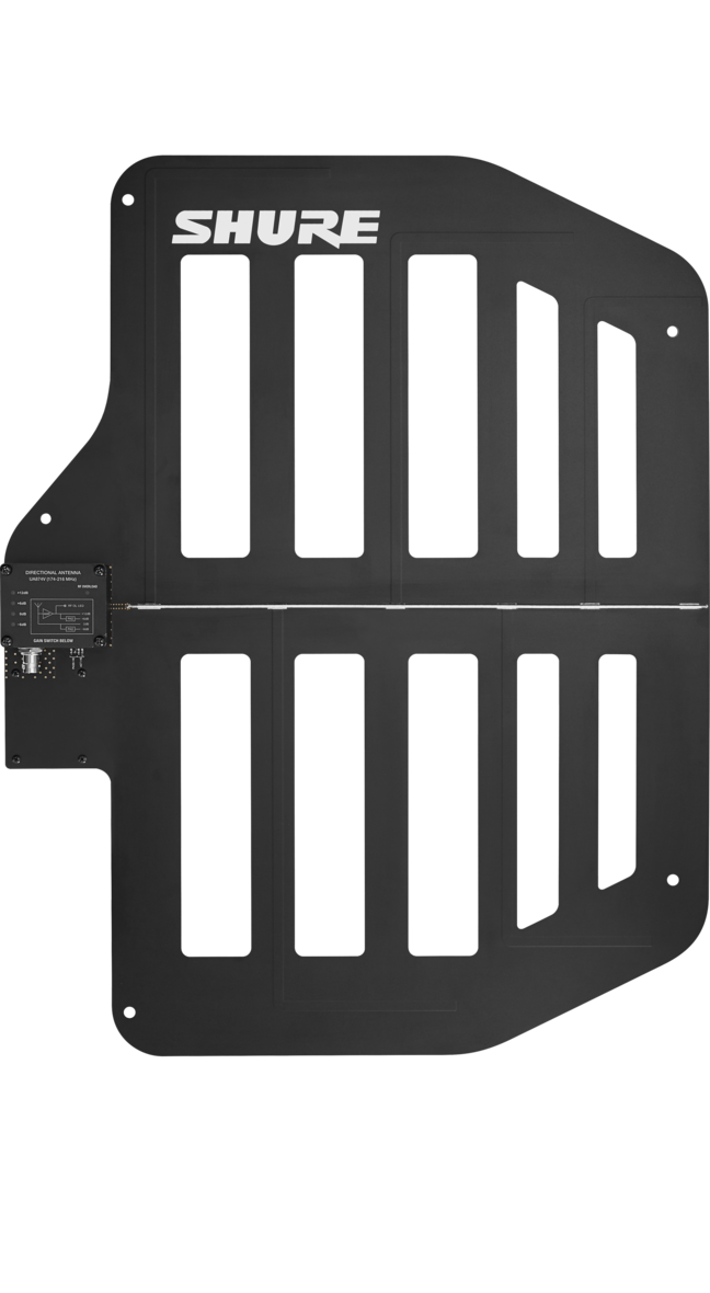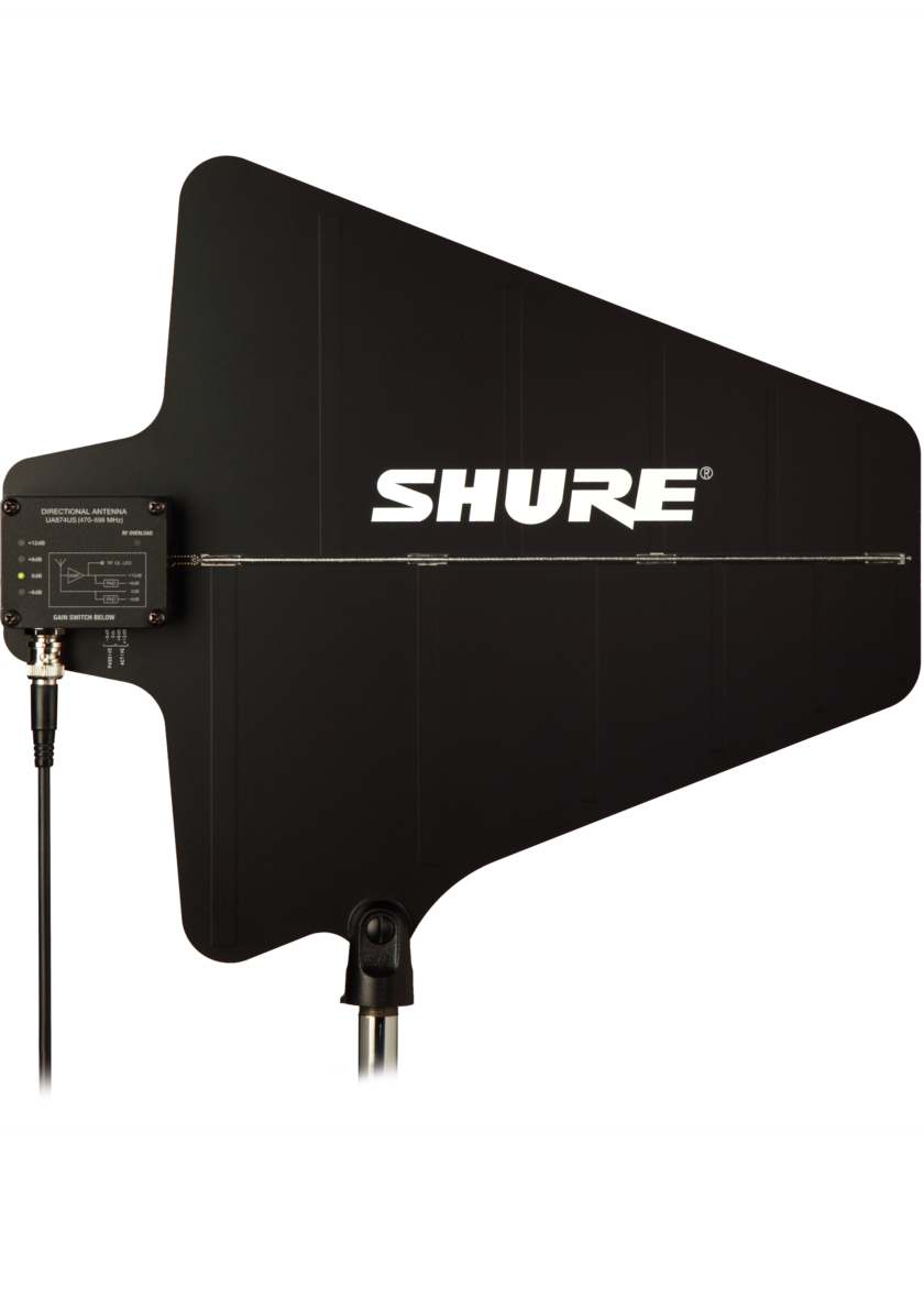 Die Shure UA874 ist eine aktive, logarithmisch-periodische Richtantenne. Im Vergleich mit einer Rundstrahlantenne bietet die UA874 einen verbesserten Empfang des gewünschten Erfassungsbereichs und eine stärkere Unterdrückung von HF-Signalen außerhalb des Erfassungsbereichs. Ein integriertes Gewinde erlaubt die Montage auf Stative.