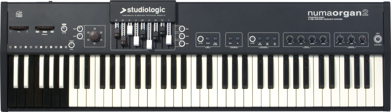 | Controller: | 2x Transpose controls , 3x Output volume / EQ knobs , 3x Percussion buttons , 3x Split controls , 4x Effect knobs , 9x Drawbars , Chorus / Vibrato knob , Dynamic touch / [MIDI] button , Pitch bend wheel , Preset / Sound button , Rotary / Modulation wheel |